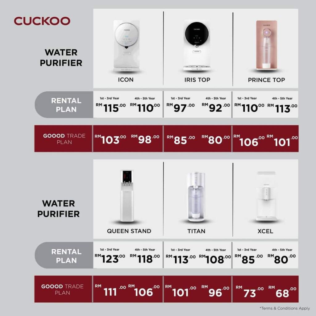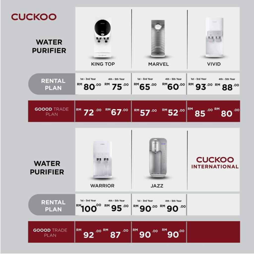 Dengan pelan ini, pelanggan Penapis Air dan Penapis Udara CUCKOO yang sedia ada boleh menukar produk semasa kepada Penapis Air dan Penapis Udara CUCKOO pada harga yang lebih rendah.